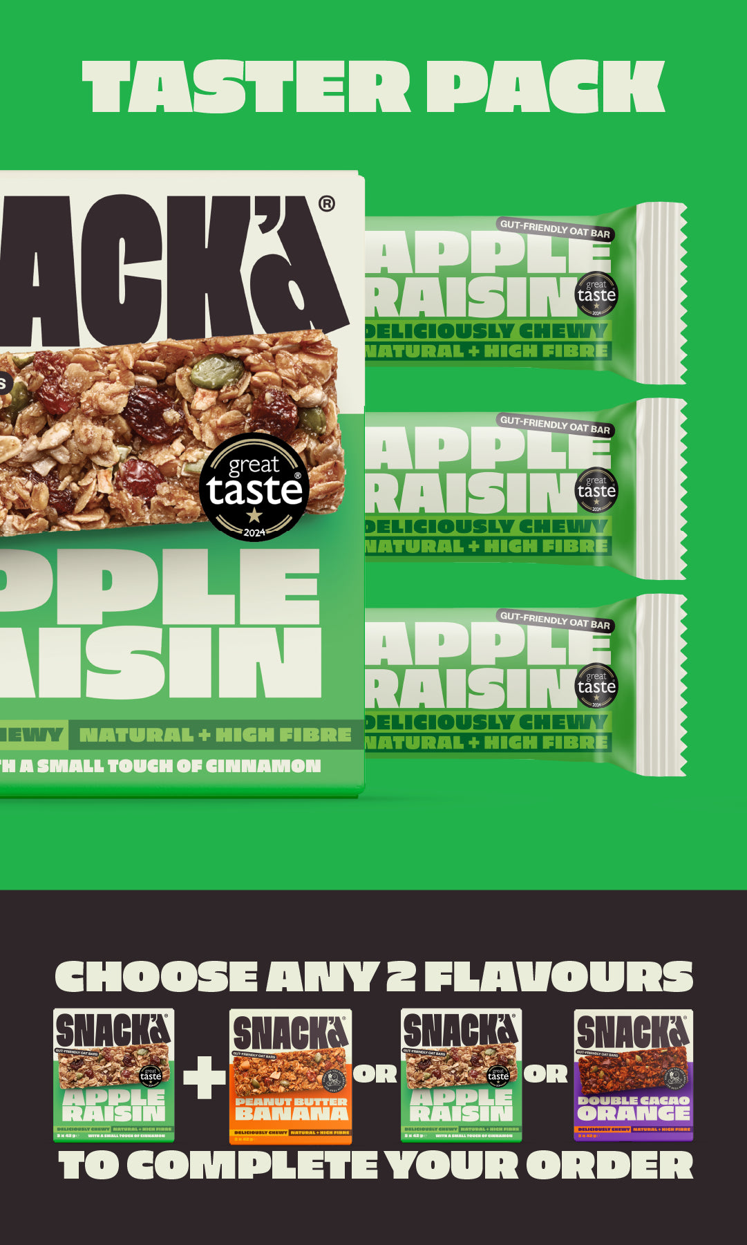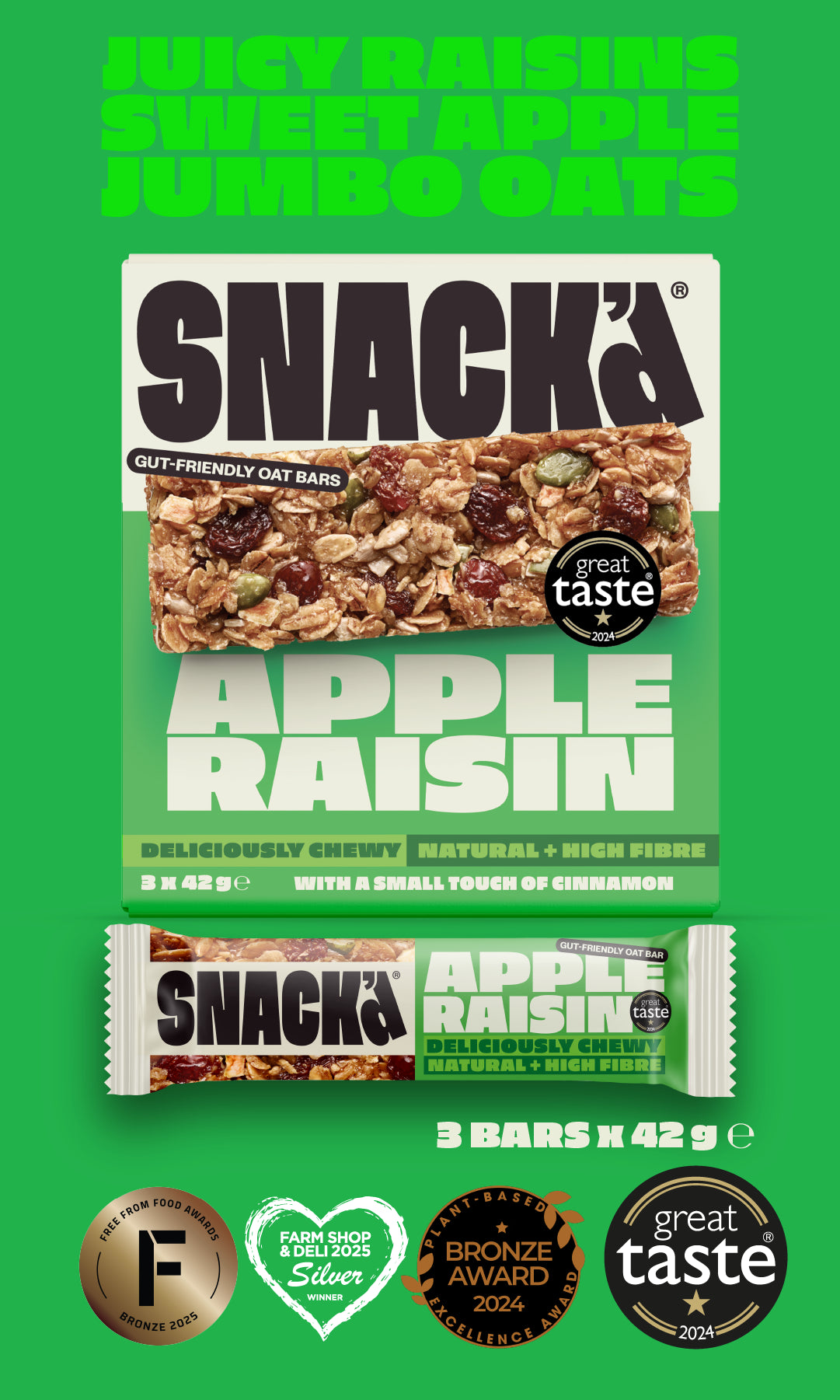SNACK'd Apple, Raisin & Cinnamon Bar – a naturally sweet, award-winning, gut-friendly snack made with jumbo oats, real apple pieces, juicy raisins, crunchy seeds, and a comforting dash of cinnamon.